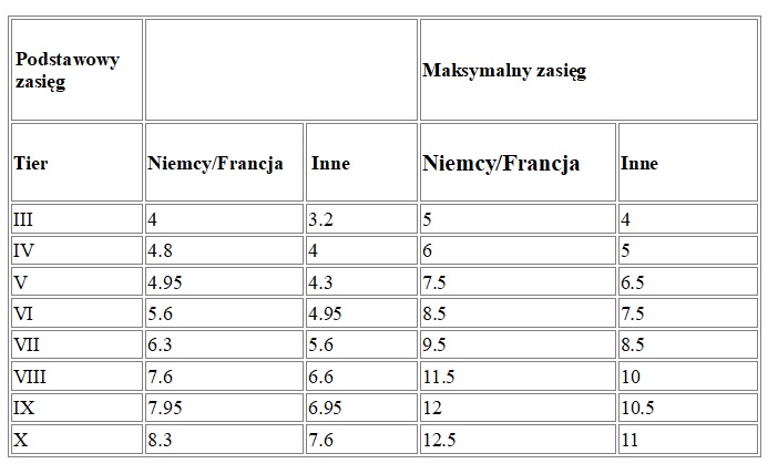 Nowe zasięgi (w km) dział baterii dodatkowej: