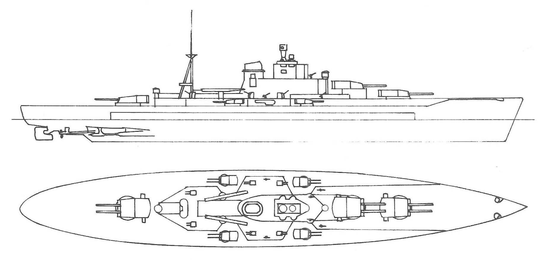 Projekt pancernika z 1928, wyporność: 23000t, długość: 195m, szerokość: 29m, zanurzenie 8m, uzbrojenie: 3 x 2 x 381mm, 4 x 2 x 152mm, 6 x 2 x 100mm, dwa samoloty, prędkość 28w.