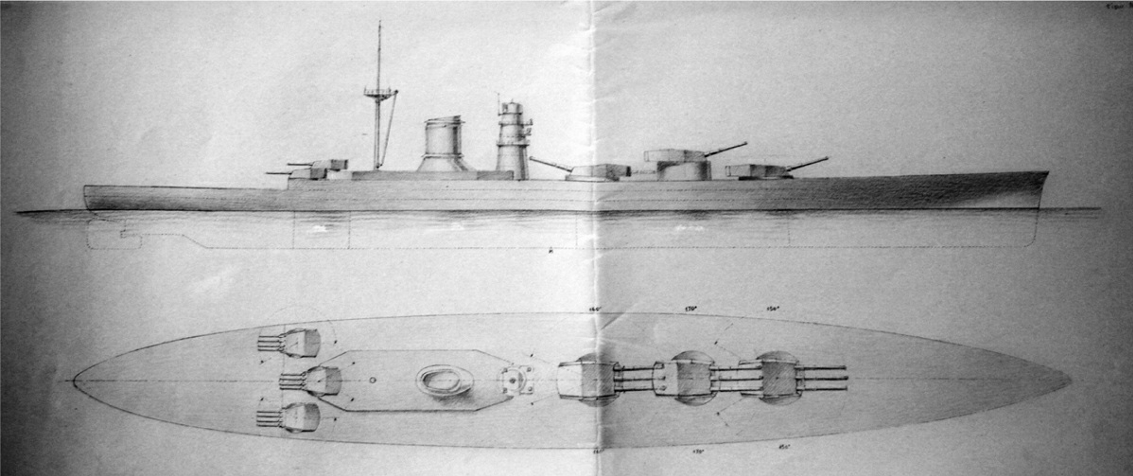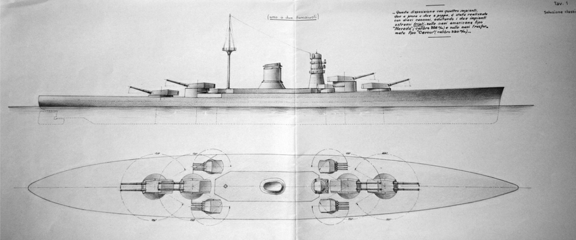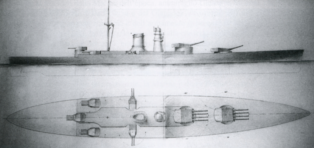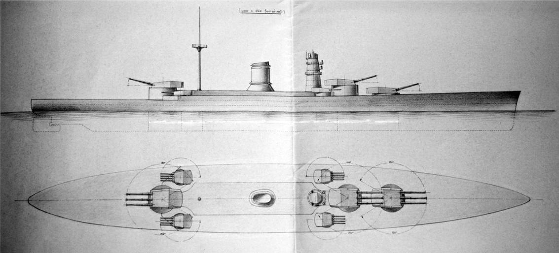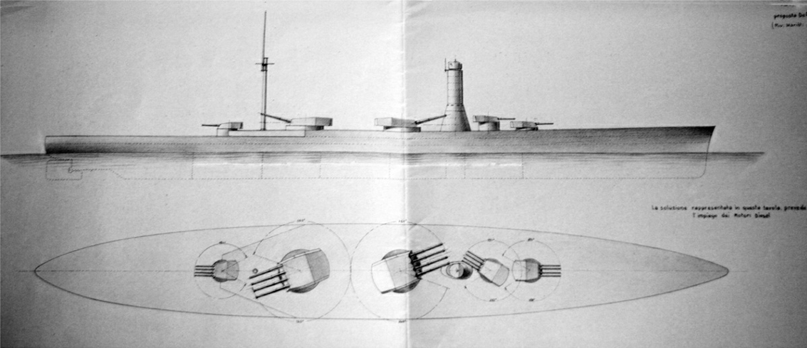 Jeden z projektów przewidywał zabudowę dwóch wież cztero działowych na śródokręciu, co ciekawe nie posiadał on komina. Projekt ten został stworzony przez admirała Vincenzo De Feo, Okręt miał posiadać napęd dieslowski, a spaliny miały być odprowadzane przez otwory w kadłubie.
