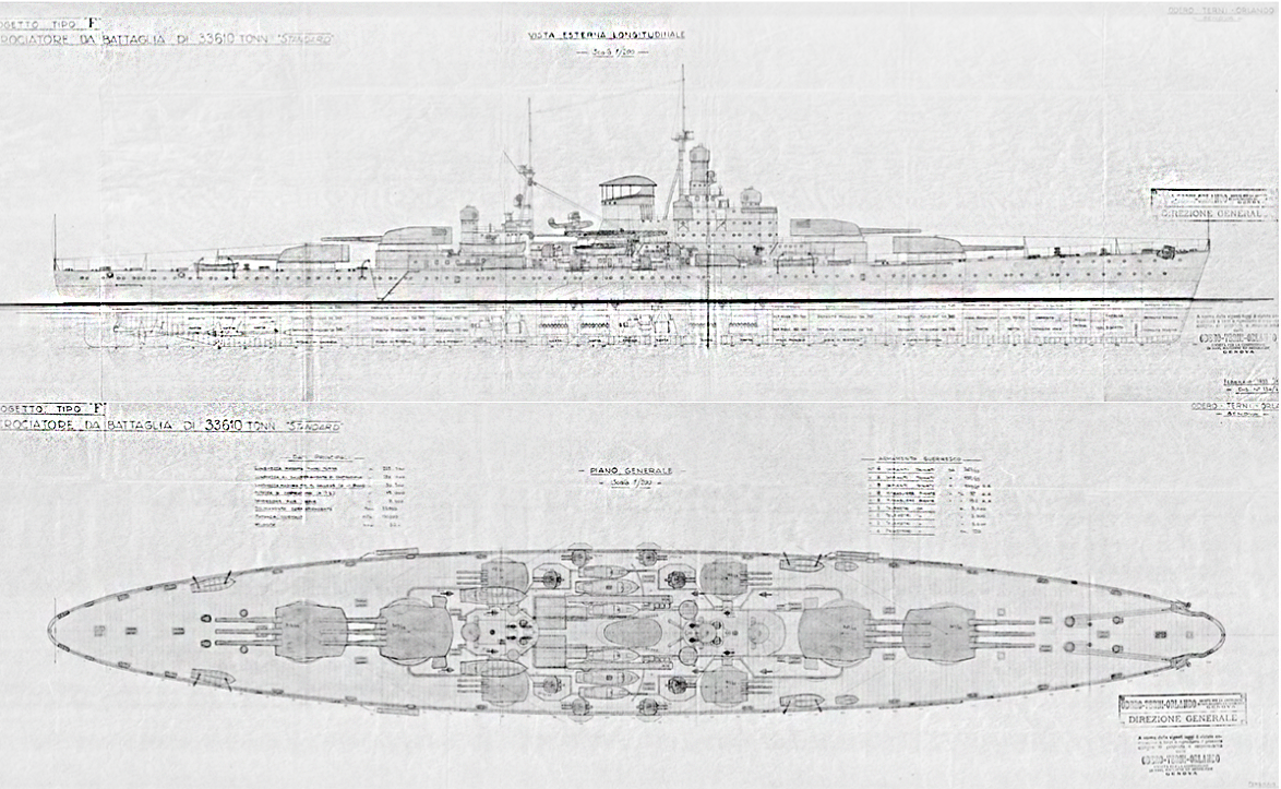W tym też czasie pojawiła się koncepcja dwóch typów okrętów liniowych dla Regia Marina, tworzących dwa odrębne zespoły. Cztery większe okręty miały stacjonować na wodach macierzystych, natomiast cztery mniejsze miały być rozlokowane w koloniach. Jako odpowiedź na zapotrzebowanie na mały okręt kolonialny w pracach włoskich pojawia się okręt przypominający niemieckie pancerniki kieszonkowe, jego wyporność miała wynosić około 18000t., okręt miał być uzbrojony w 6 dział kalibru 343mm, w dwóch wieżach, po jednej na dziobie i rufie oraz prędkości maksymalnej 26w. (projekt Ansaldo 770).
