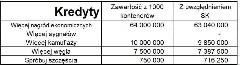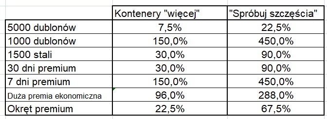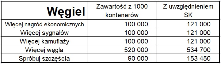 W tych samych kosztach można wybrać także 16 kontenerów z węglem - jest to 24% szans na superkontener i ok. 8200 węgla. To jest już sprawa dyskusyjna. Pamiętajmy jednak, że klan to dość przypadkowy zbiór ludzi, i wśród nich na pewno trafi się sporo osób nie płacących. Parę tysięcy sztuk węgla nie zrobi takiej rewolucji jak superkontener z dublonami lub czasem premium.
