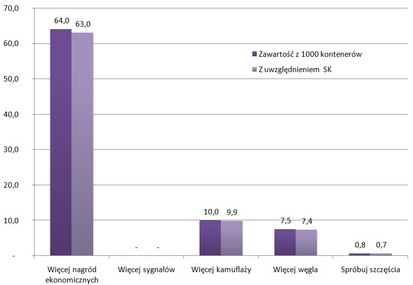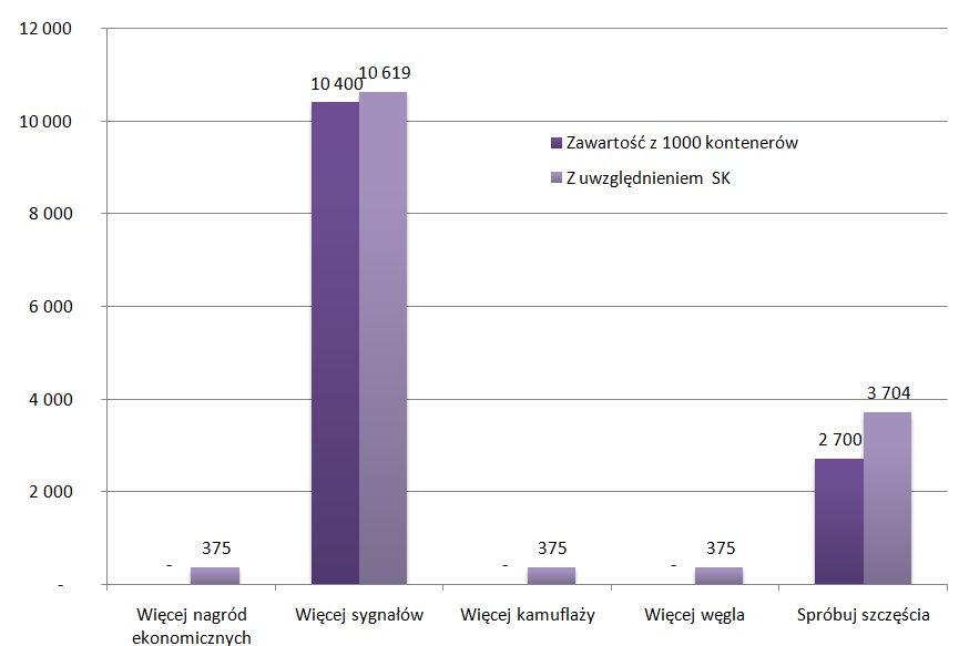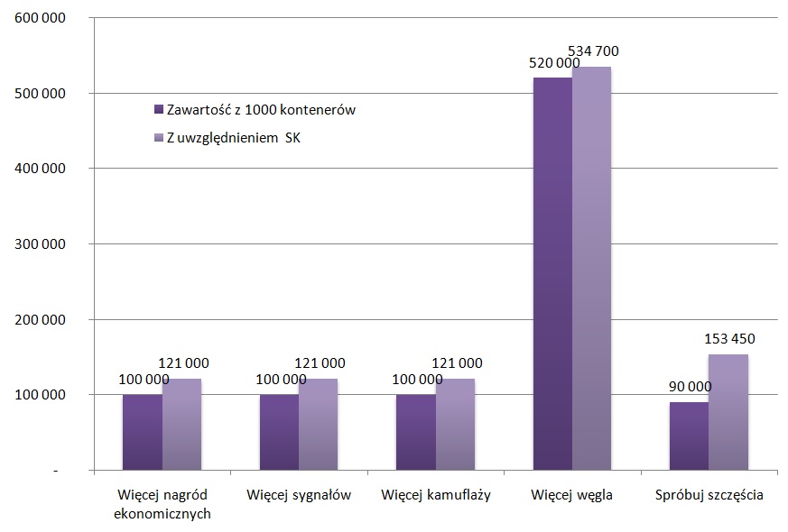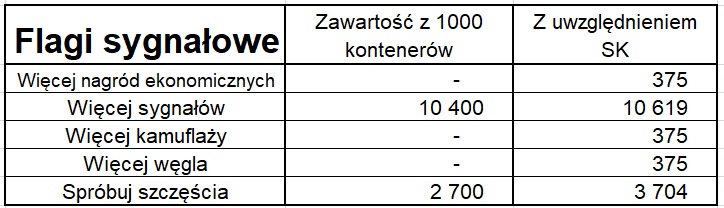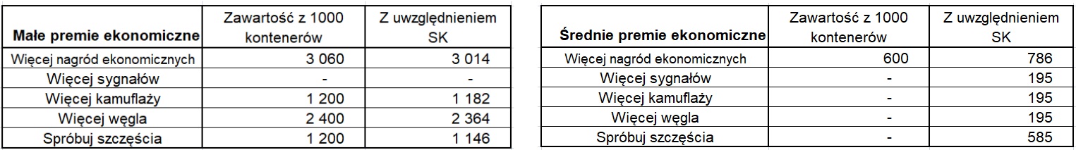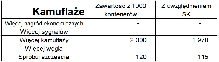 Zestawiając wszystkie zawartości w jednej tabeli, z uwzględnieniem szansy na superkontener, uzyskujemy następujące wyniki, zakładając otwarcie 1000 kontenerów danego typu: