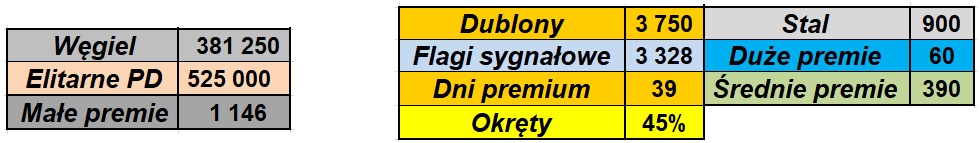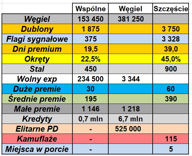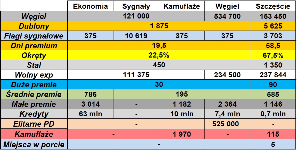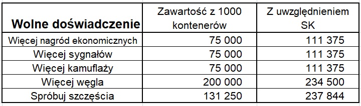 Pod względem wolnego doświadczenia Węgiel i Szczęście przeganiają dwukrotnie konkurencję. Przy tym pierwszym przychód jest bardziej regularny. Dodatkiem do kontenera z węglem jest wolne PD dowódcy, średnio po 500 na kontener - skumulowany pozwoli zrobić kapitana z kilkunastoma punktami umiejętności.