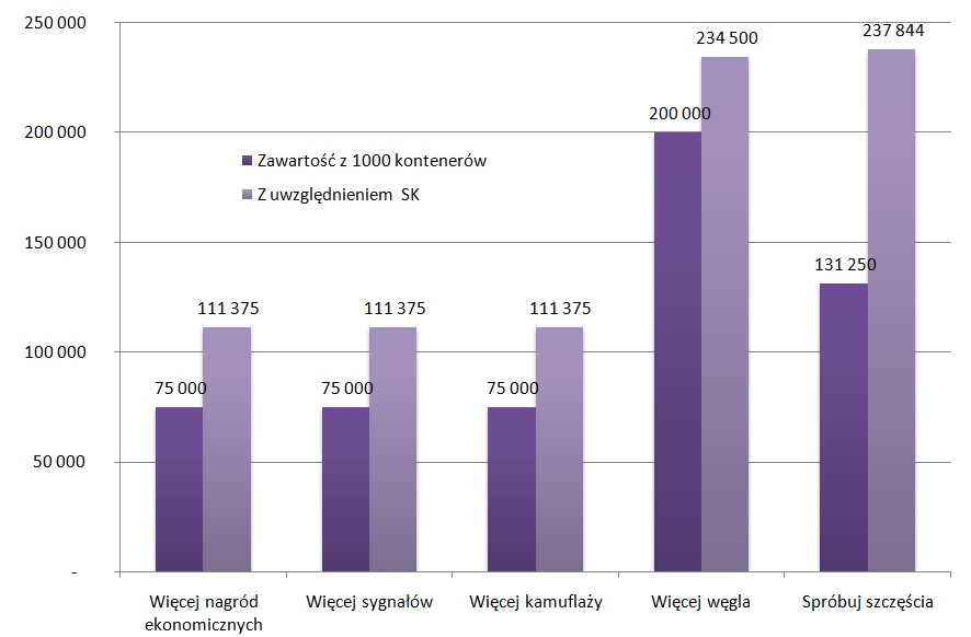 Porównując koszty w ropie, za równowartość jednego superkontenera można kupić 13,3 “spróbuj szczęścia”, co przekłada się na 60% szans otrzymania superkotenera, do tego dochodzi zawartość niecałych 13 małych kontenerów. Lepszym wyborem jest więc superkontener.