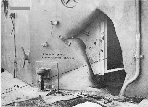 Dziura po trafieniu krążownika San Francisco pociskiem kalibru 356mm