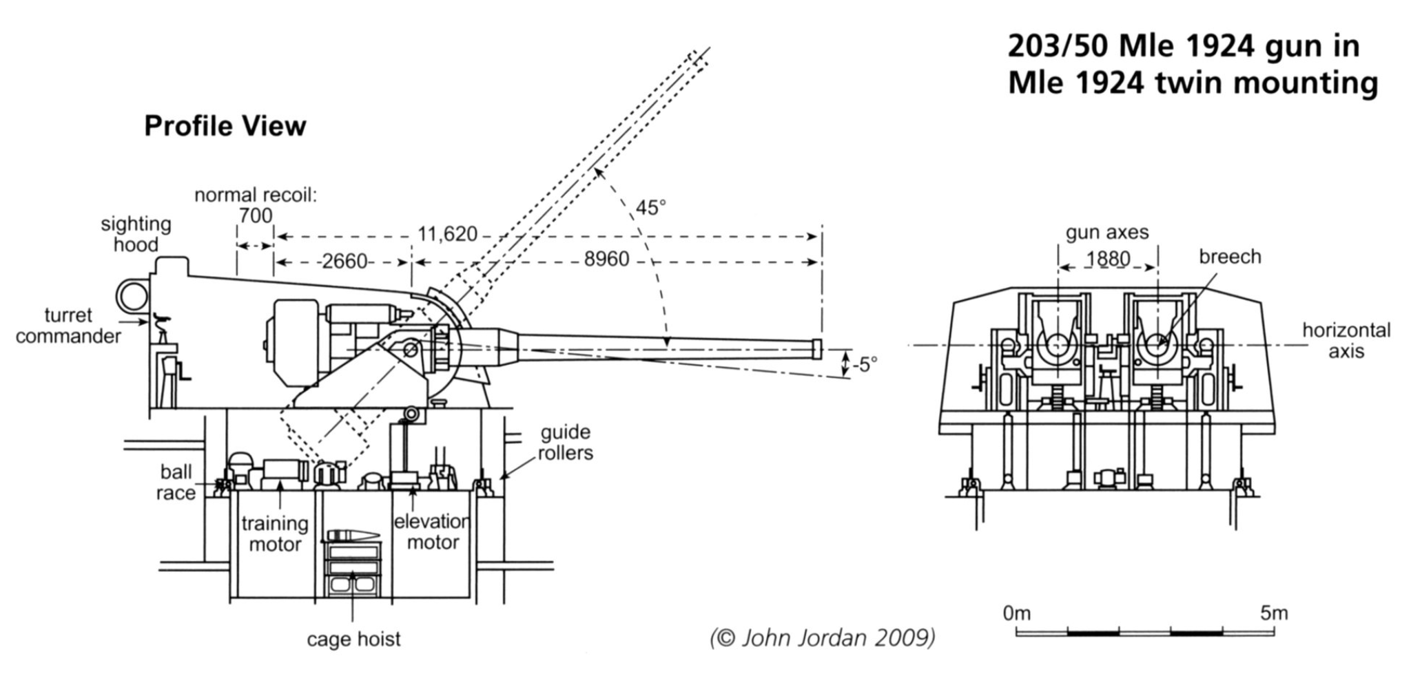 Działa 203mm Mle 1924 były nową konstrukcją, zaprojektowaną dla opisywanych krążowników. Wysoki kąt podniesienia (+45°) pozwalał na strzelanie na 31400m pociskami przeciwpancernymi i na 30000m pociskami odłamkowo – burzącymi. Pociski przeciwpancerne i odłamkowo – burzące ważyły odpowiednio 123kg i 123,8kg. Od 1936 wprowadzono nową amunicję ze słabszym ładunkiem miotającym za to o większym ciężarze (134kg). Samo działo ważyło około 20,4t. i oddawało 4-5 strzałów na minutę. Prędkość ich podnoszenia to 10° na sekundę. Maksymalny kąt podniesienia, przy którym mogły być ładowane to 10°. Wieża z dwoma działami ważyła 180t. Obracała się z prędkością 6° na sekundę. Na okrętach zamontowano cztery takie wieże, po dwie na dziobie i rufie w superpozycji.